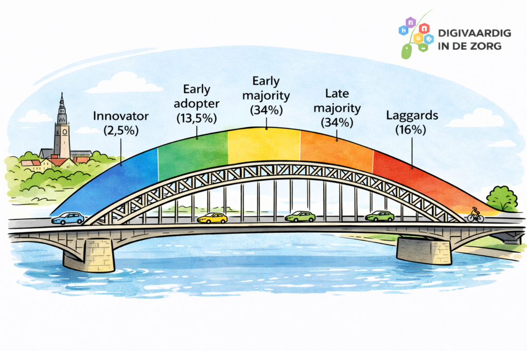 Zorgtechnologie wordt slimmer en software intuïtiever. En toch… als ik bij teams in de zorg en bij leidinggevenden de adoptiecurve van Rogers uitleg, krijg ik na hun teamanalyse nog steeds vrijwel dezelfde verdeling als Rogers weergaf in het model in 1962.