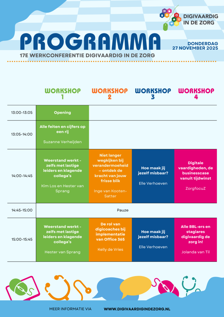 In deze workshop krijg je allereerst informatie over alle initiatieven die lopen in het onderwijs, want er gebeurt veel! Daarna gaan we samen op zoek naar hoe we met behulp van vijf concrete ideeën de samenwerking tussen zorg en onderwijs kunnen stimuleren om tijdens stages en leerwerktrajecten meer aandacht te besteden aan digitale vaardigheden. Voor projectleiders en digicoaches!